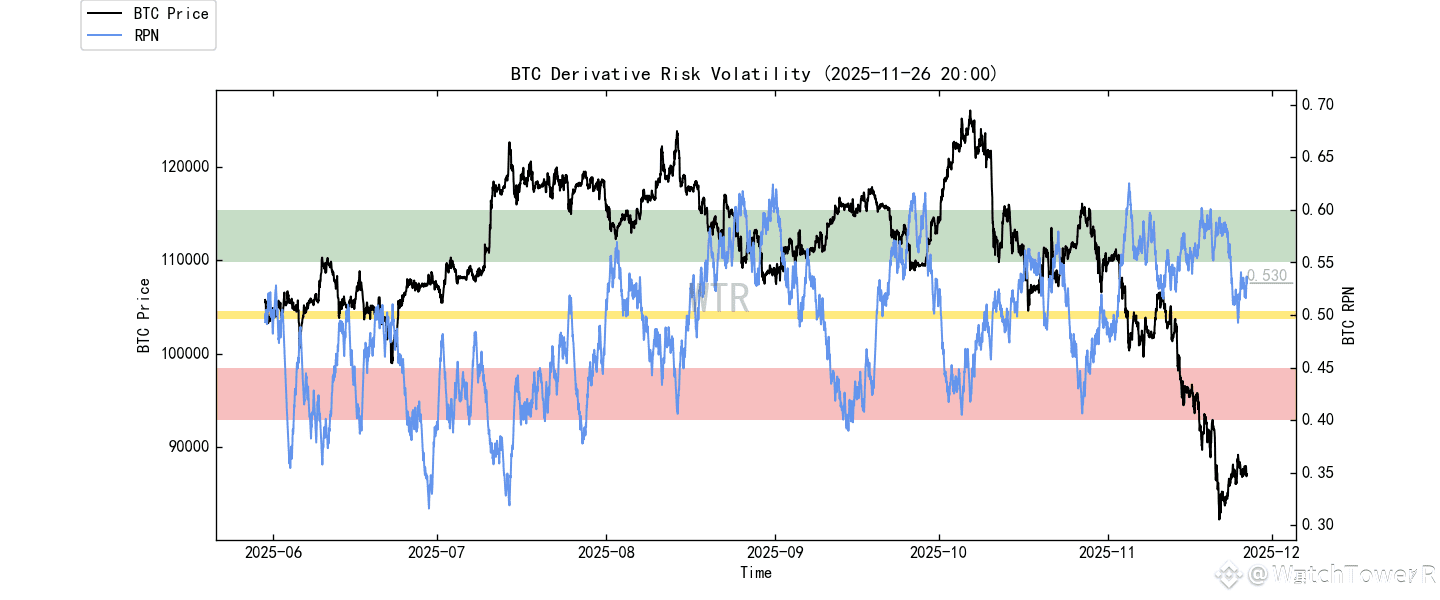 价格从 91k 一路跌到 80.6k,随后反弹到 87–88k 区间,链上抛压指数并没有明显回落,而是停在中等偏上。