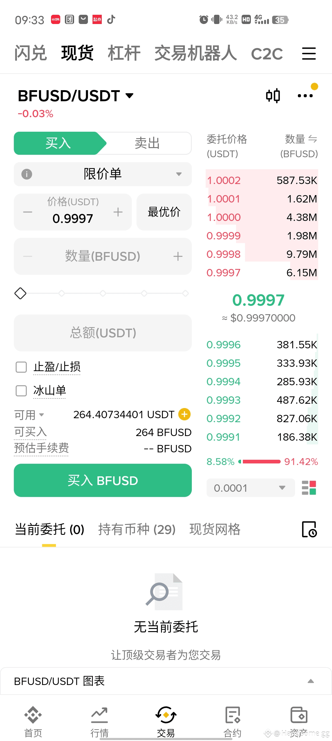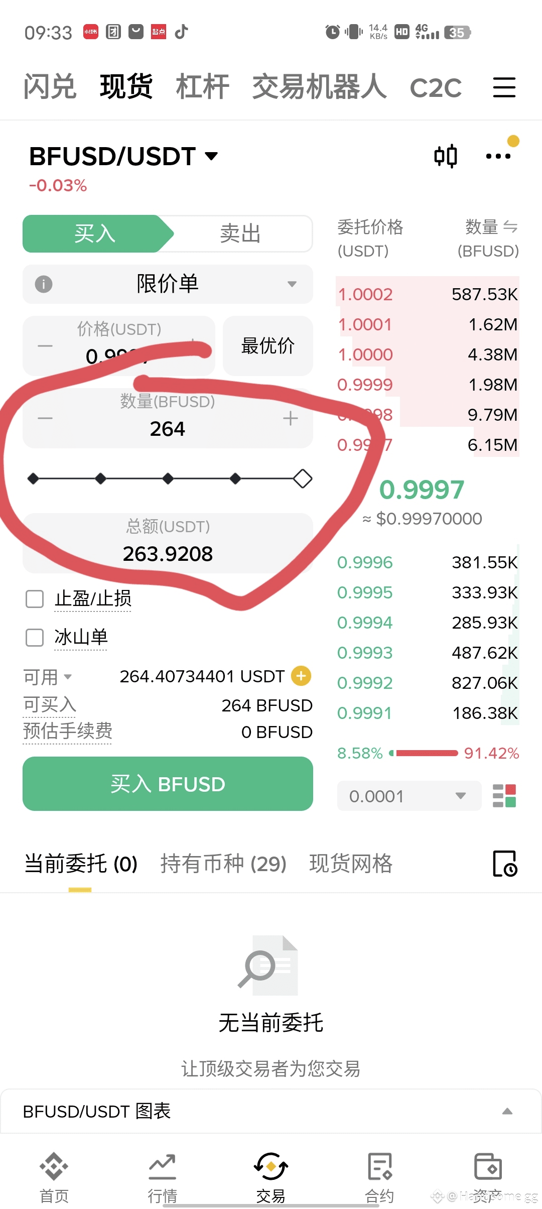 第三步,确定金额,现在价格是0.9996,只要低于1u,都有套利空军,如果大于1u,那就别买。