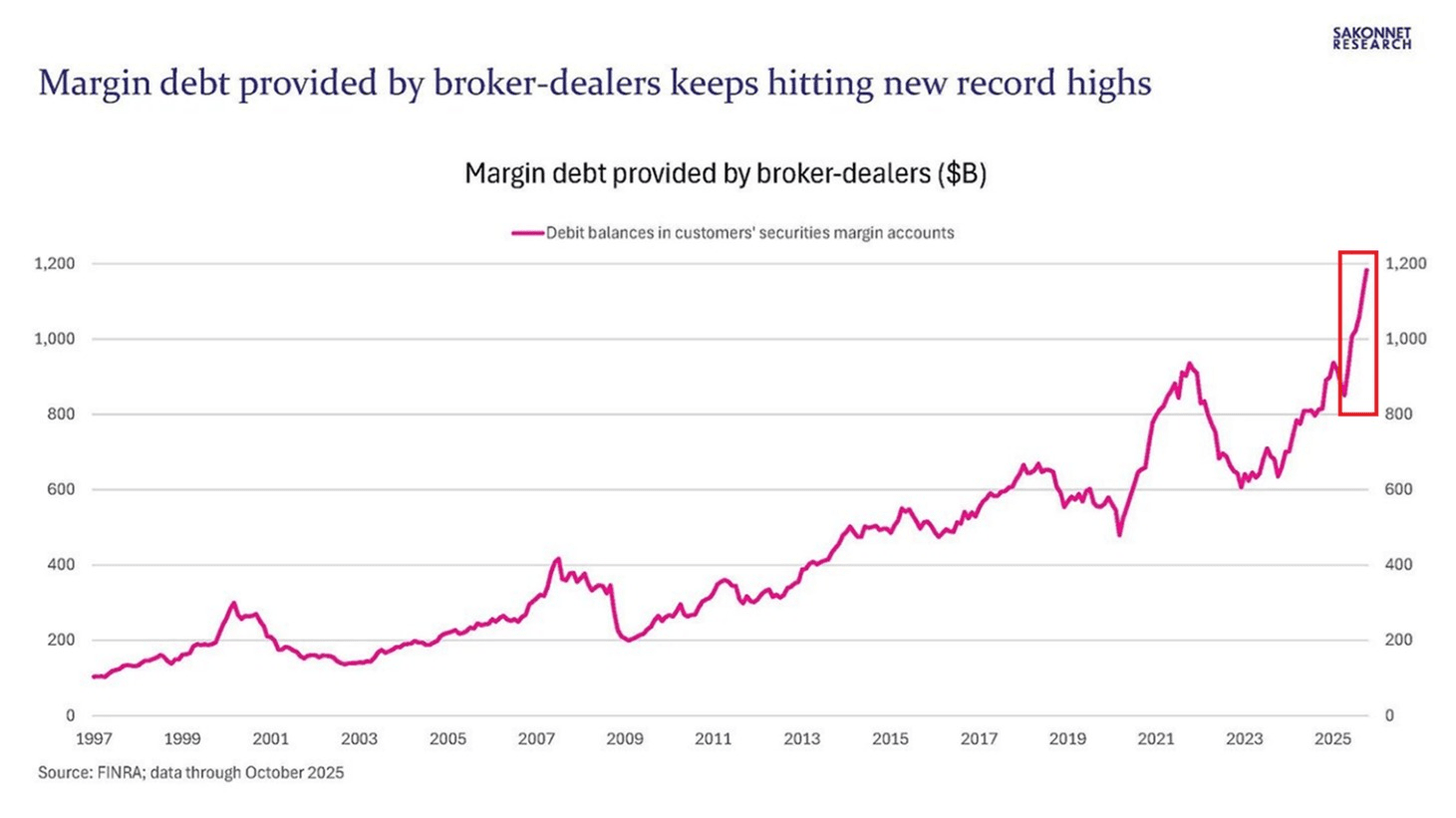 KobeissiLetter发布的数据表明,美国的保证金债务在十月份激增了572亿美元,使总保证金借款达到了创纪录的1.2万亿美元。这标志着连续第六个月的增长,并突显出美国投资市场杠杆的激增。