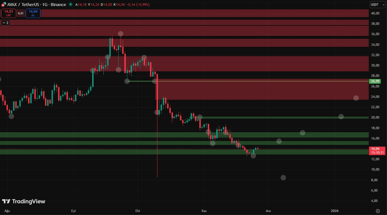 在#SocialMining 组中追踪$AVAX 情绪和社区讨论的过程中,分析师们花了一周时间评估Avalanche如何在接近其主要历史支撑区间(14.00水平附近)时,继续深入其下降结构。这些去中心化圈子内部的集体解读突显出同样的结论:买家尚未重新夺回控制权,市场动能牢牢掌握在卖家手中。
