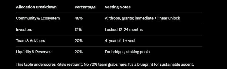 $KITE 不是炒作的食料;它是这个生态系统的氧气。总供应量为 100 亿,主网(于 2025 年第四季度启动)流通量为 18%,并且分配偏向社区(48%)而非内部人士(20% 团队,直至 2027 年),旨在实现长期可持续性。