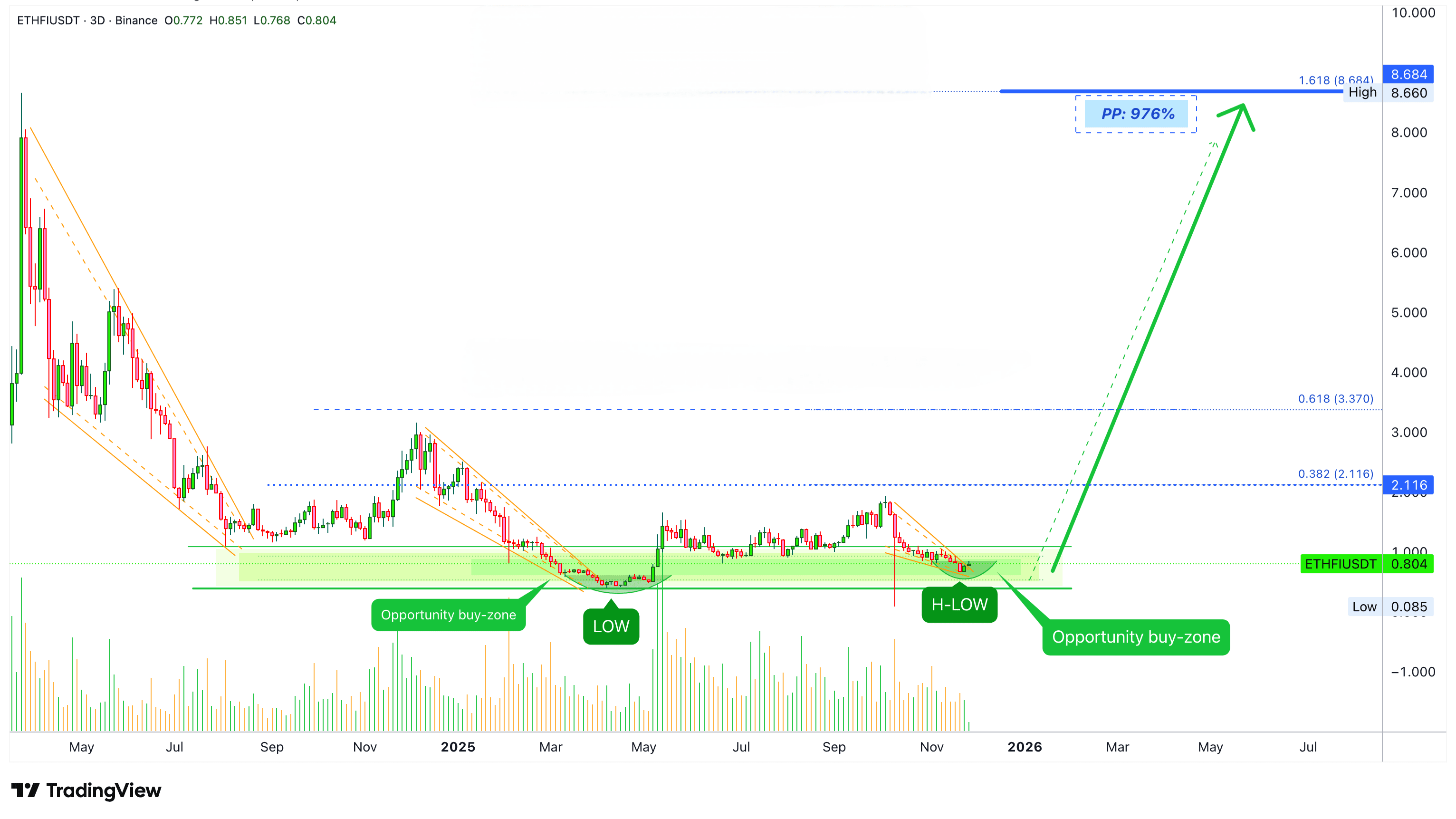 在这里,我们有一个有趣的项目,配有有趣的图表和有趣的情况。Ether Fi 的交易价格相比四月处于一个更高的低点,但仍然在“机会买入区间”内。