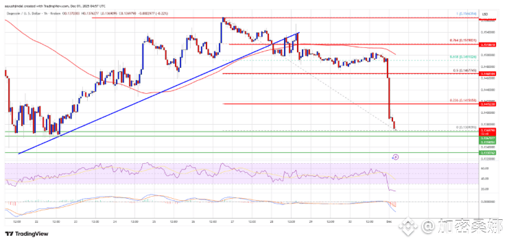 自从收盘价跌破 0.1520 美元,狗狗币就开启了 “破位连杀”:0.150 美元、0.1450 美元支撑位跟纸糊的似的,直接被砸穿!