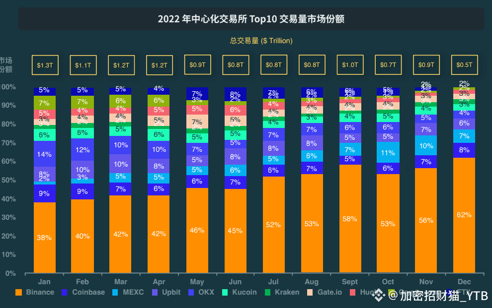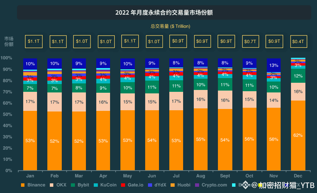 我们再来看下22年的情况,22年是熊市的一年,我们看到无论是永续还是现货,相较21年都有所下降。虽然市场在收缩,但是币安的份额来到了惊人的62%。这一年,币安的市场份额达到了它这5年来的巅峰,随后开始慢慢走下坡路。okex也是在这一年更名为okx。