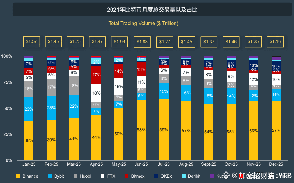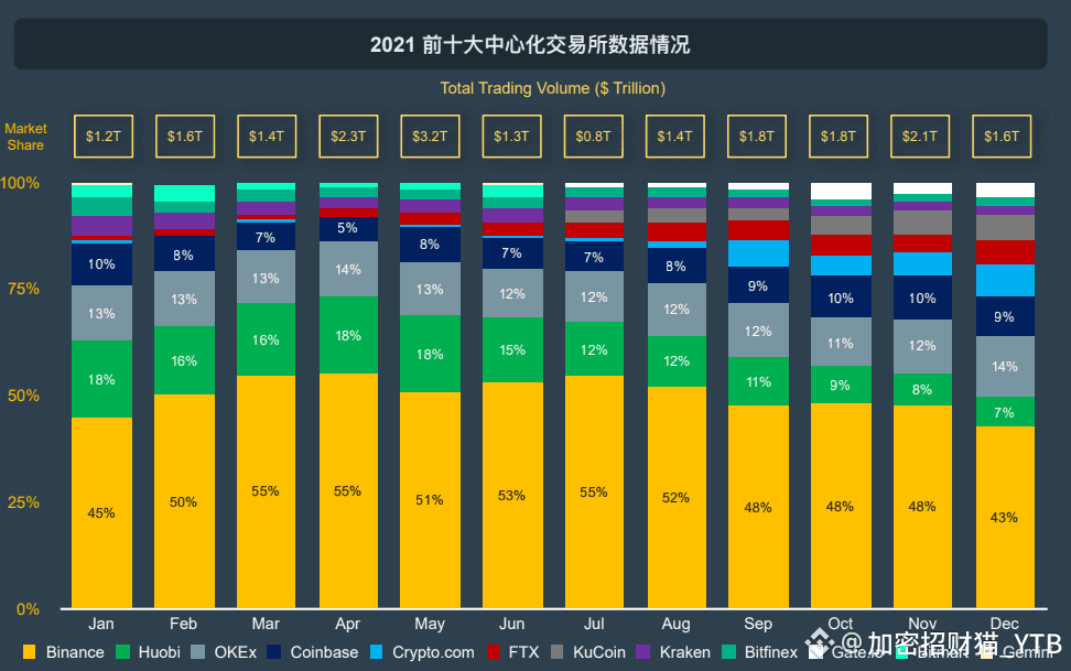 我们继续看下21年的情况,21年现货和永续交易量直接从20年的千亿级来到了万亿级。可以看到,全年都稳定在1万亿以上。我们来看下格局,币安这一年在永续赛道和现货赛道都展现了绝对的统治力,尤其是永续赛道,市场份额更是从年初38%进一步上升到了年末57%。