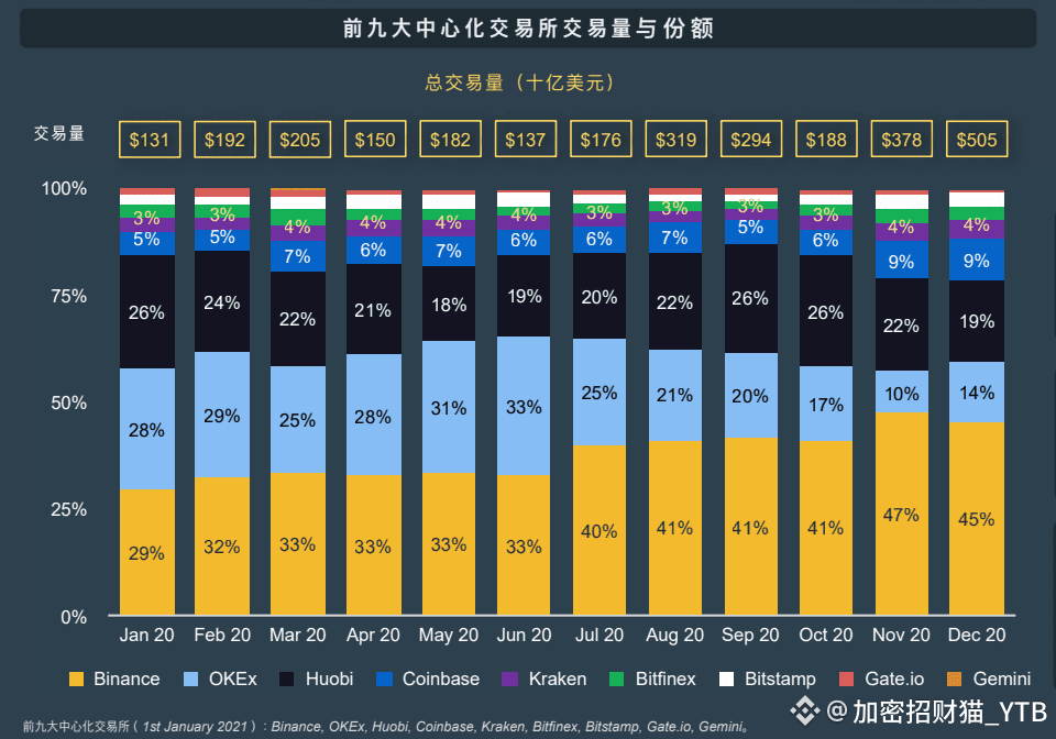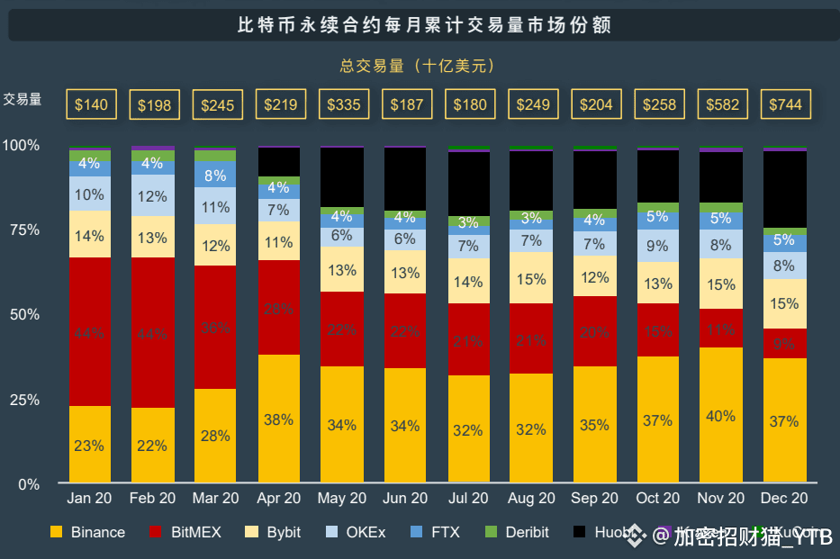 我们先看下20年的情况,为什么要看20年呢?因为20年是加密货币交易所起步的一年,也是币安一统江湖的一年。可以看到,无论是现货还是永续,年初都是从1千亿的量级开始慢慢增长,到了20年12月,也就是defi summer前夕,现货的交易量来到了5千亿美元,永续的交易量是7千亿美元。我们来看下当时格局,那年是币安慢慢开始占领市场的一年,在现货市场上,年初的时候它和okex还是旗鼓相当,29%对28%,经过了一年的时间,币安的市场份额已经来到了45%,而okex则掉落到了14%。我们再看永续市场,年初的时候老大还是bitmex,市场份额44%,年末的时候只有9%了,而币安的份额则从23%增加到了37%。为什么bitmex直接从绝对龙头的位置跌到只剩9%的份额了呢?bitmex的故事或许对于我们也是一个警醒的故事。2020 年 10 月,美国商品期货交易委员会对 BitMEX 的创始人及其相关实体提起诉讼,指控他们运营未注册的交易平台并违反了反洗钱规定。创始人被捕给公司的声誉和运营稳定性带来了巨大冲击。这些监管行动直接导致大量用户出于对资金安全的考虑,将资产转移到了币安等交易所。对于中心化交易所来说,谁又能保证不是下一个bitmex呢?