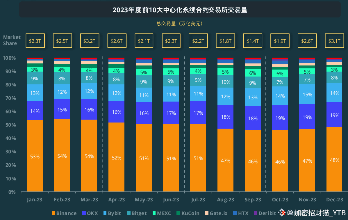 我们来总结一下,cex22年的现货月平均交易量是0.93万亿,永续月平均交易所是0.91万亿。22年是深熊的一年,相对于市场80%价格的跌幅,交易所的交易量跌幅不到50%。不仅如此,我们还可以看到,无论市场涨和跌,现货交易量和永续交易量这三年都是旗鼓相当的。但是这样的格局很快就要打破了。