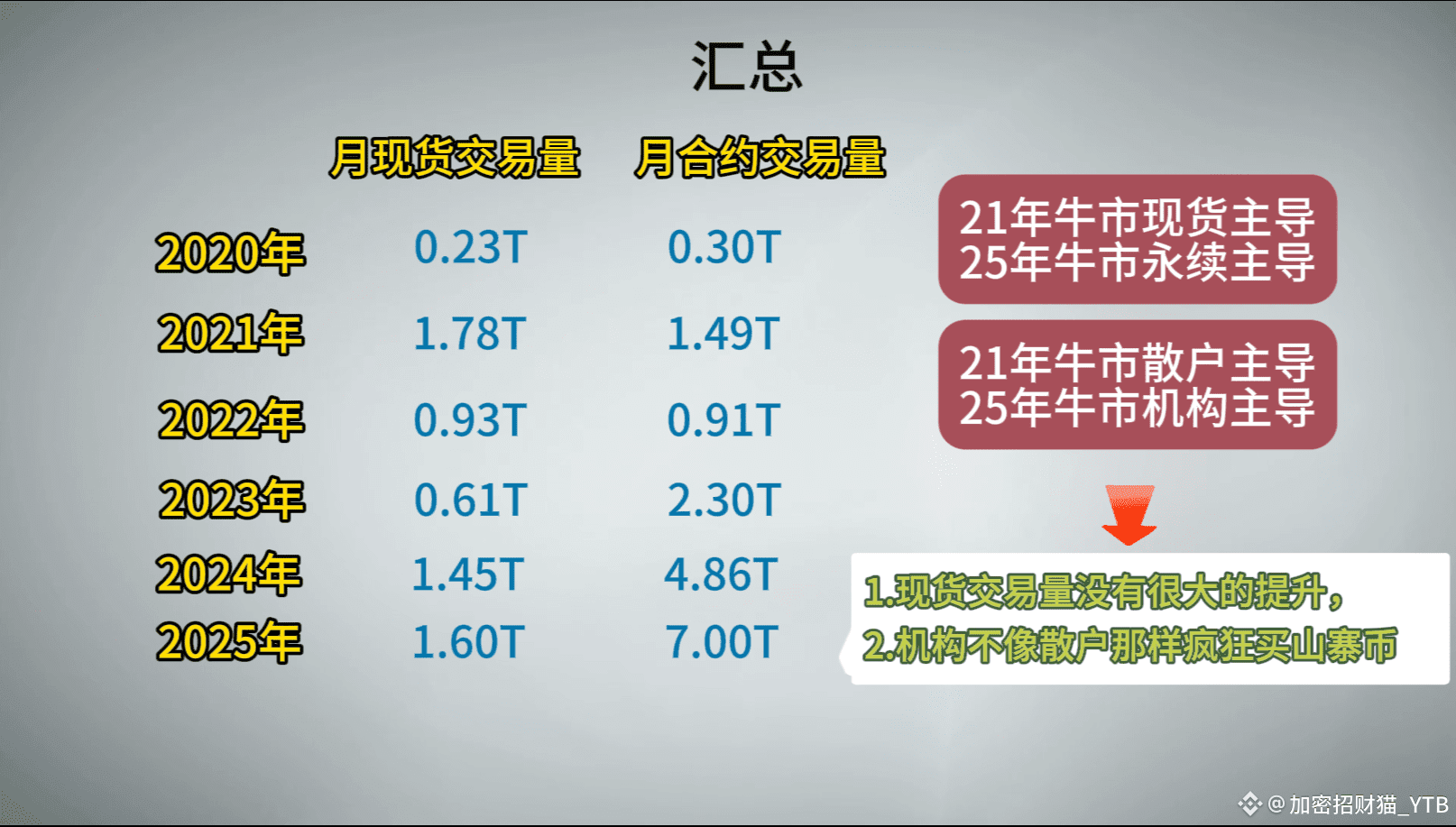 观看这5年数据,如果说21年的牛市是现货市场推动的,那么25年的牛市是永续合约占据主导的。这也说明了,这一轮的牛市,并没有很多零售投资者进场,而更多的是机构入场。因为机构入场带来了资金和行情,但是并不会带来现货交易量的提升,他们不会像散户一样频繁进行操作买卖。如果是散户大量进场,那么一定会出现现货和合约一起增长的情况。正式因为这轮牛市是机构进场,带来的结果是,第一,现货交易量没有很大的提升,第二,机构不会像散户那样疯狂的购买山寨币,他们的目标很明确,就是比特币。所以这轮我们没有看到山寨季。我们观察24年的交易,可以发现,未来的关键变量,依旧是美联储的货币政策。如果美联储继续降息,并从“缩表”转向“扩表”,那么加密市场的零售投资者讲再次入场,现货交易量会率先复苏,资金将不再只集中在 BTC,而是全面扩散。