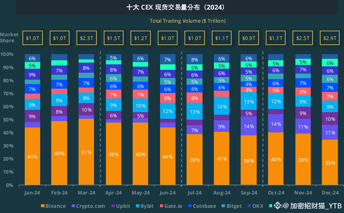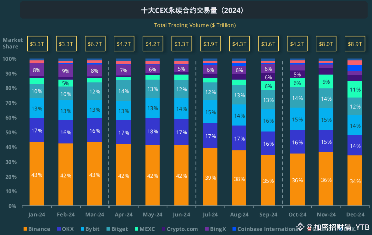 总结一下,cex24年的现货月平均交易量是1.45万亿,永续月平均交易所是4.86万亿。这一年,市场有两个变化,第一,永续合约交易量进一步领先现货交易量。第二,币安的市场份额继续萎缩到34%左右。