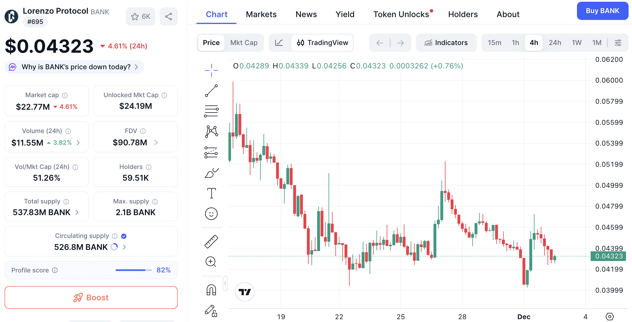 在去中心化金融(DeFi)这个多变的世界中,少数代币能像洛伦佐协议的原生代币BANK一样捕捉创新与市场敏感性的结合。截至今天,2025年12月2日,BANK的交易价格约为$0.04323,反映出过去24小时内急剧下跌了4.61%。这一跌幅使其市值约损失了130万美元,降至2277万美元,而交易量约为1155万美元—上升了3.82%,但仍不足以阻止下滑。流通供应量为5.268亿BANK,总供应量为5.3783亿(最高供应量限制在21亿),该代币的价格行为正受到密切关注。
