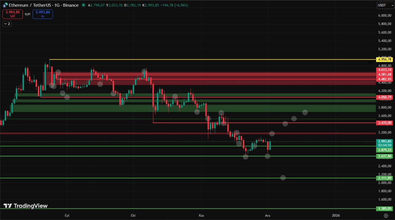 该图表勾勒出一个纠正模式,该模式在周期初期的4,400–4,800阻力层中经历了多次拒绝后开始。从那时起,ETH持续形成更低的高点,加强了向下的结构。最近向2,993–3,033范围的上涨表明短期买家活跃,但较大的结构性阻力仍然存在于3,435和4,050之上。
