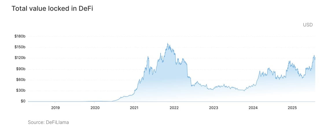 故事始于基础设施。比特币引入了自我保管和稀缺性;以太坊通过智能合约扩展了这一基础,将区块链变成了能够运行金融服务的可编程平台。在过去五年中,这一架构催生了一个平行的、透明的信用和交易生态系统,称为去中心化金融(DeFi)。虽然相对于传统市场仍然是小众市场,但DeFi的总锁定价值从2018年的不到100万美元增长到高峰时超过1000亿美元(DefiLlama)。即便在2022年的下滑之后,活动也迅速回升。