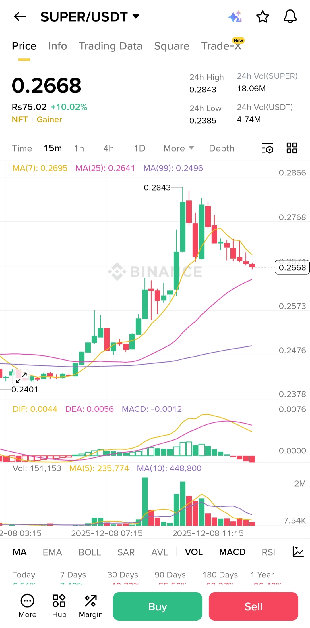 因为SUPER目前正在回撤到15分钟图表上的7MA + 25MA支撑区。这一区域通常在动量驱动的走势中充当反弹区。买家自然会等待这个折扣区,而不是追逐顶部。