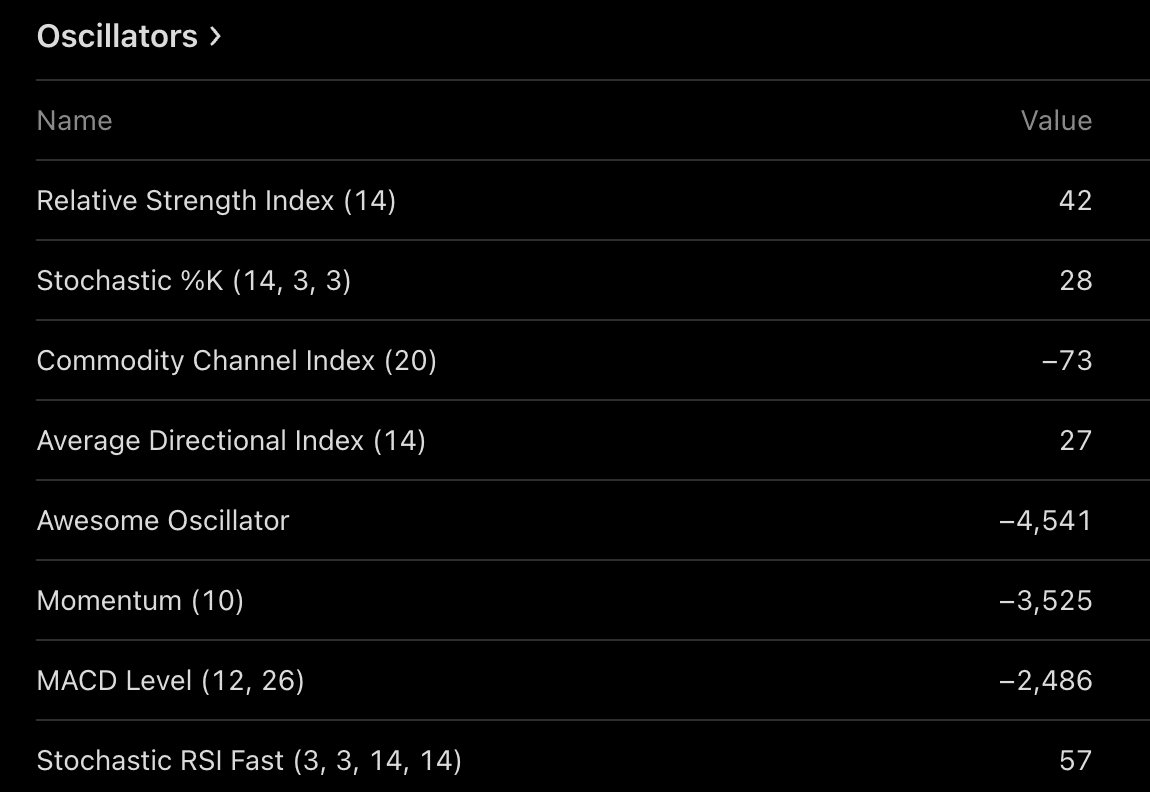 從振盪器面板來看,相對強弱指數(RSI)爲42,表明中性但動能減弱,而動量(10)指標爲–3,525,顯示出短期強度下降。與此同時,MACD水平(12,26)爲–2,486,反映出負動能的持續性。