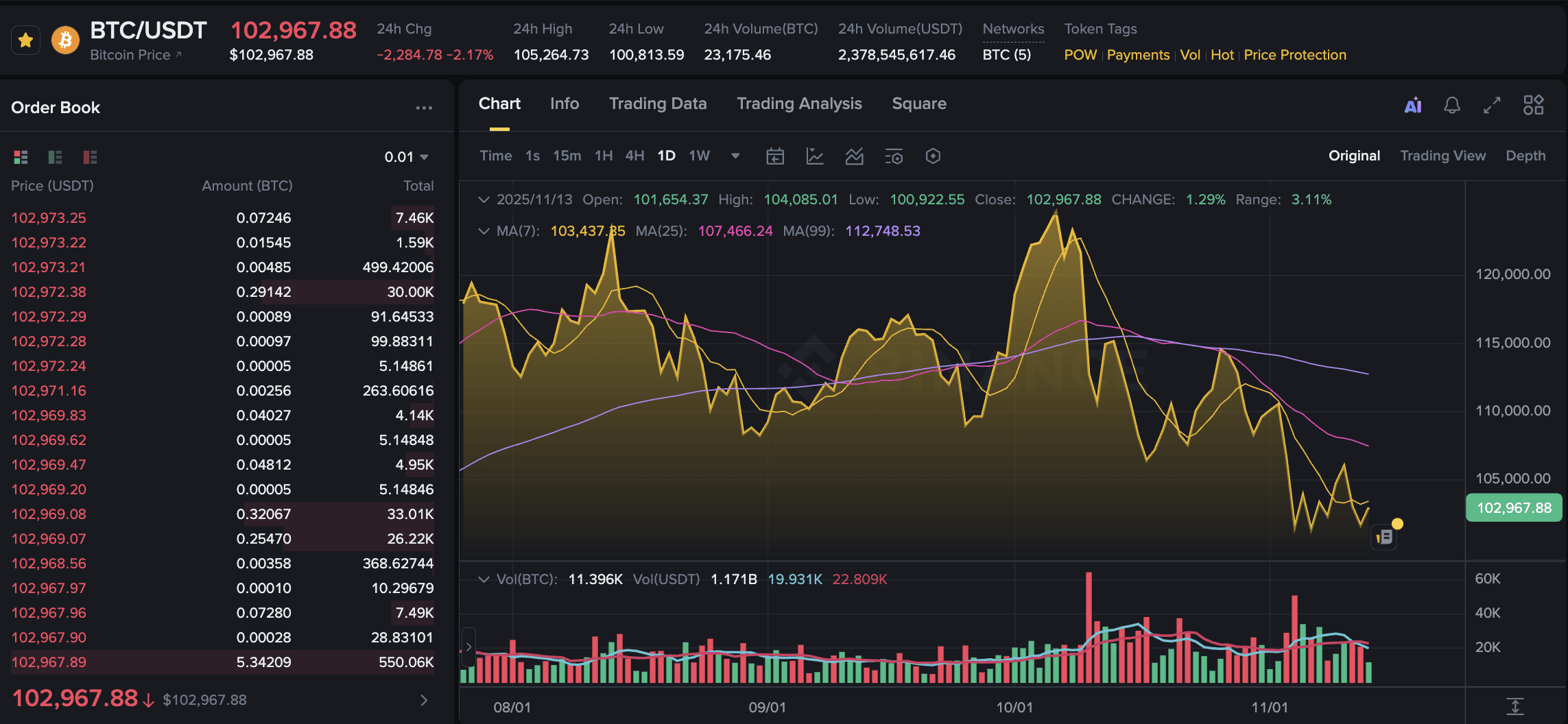 比特幣價格下跌2.17%,至$102,967,表現不及更廣泛的加密市場(-1.77%)
