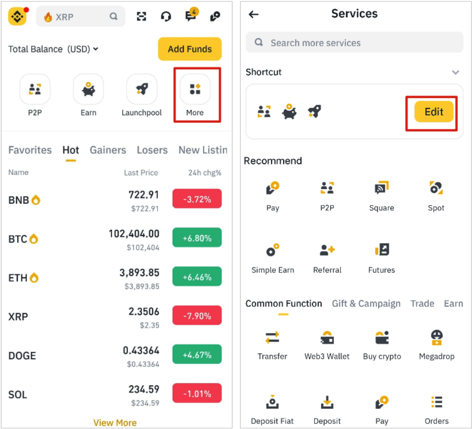 在主頁上點擊[更多],然後在服務頁面上選擇[編輯]。