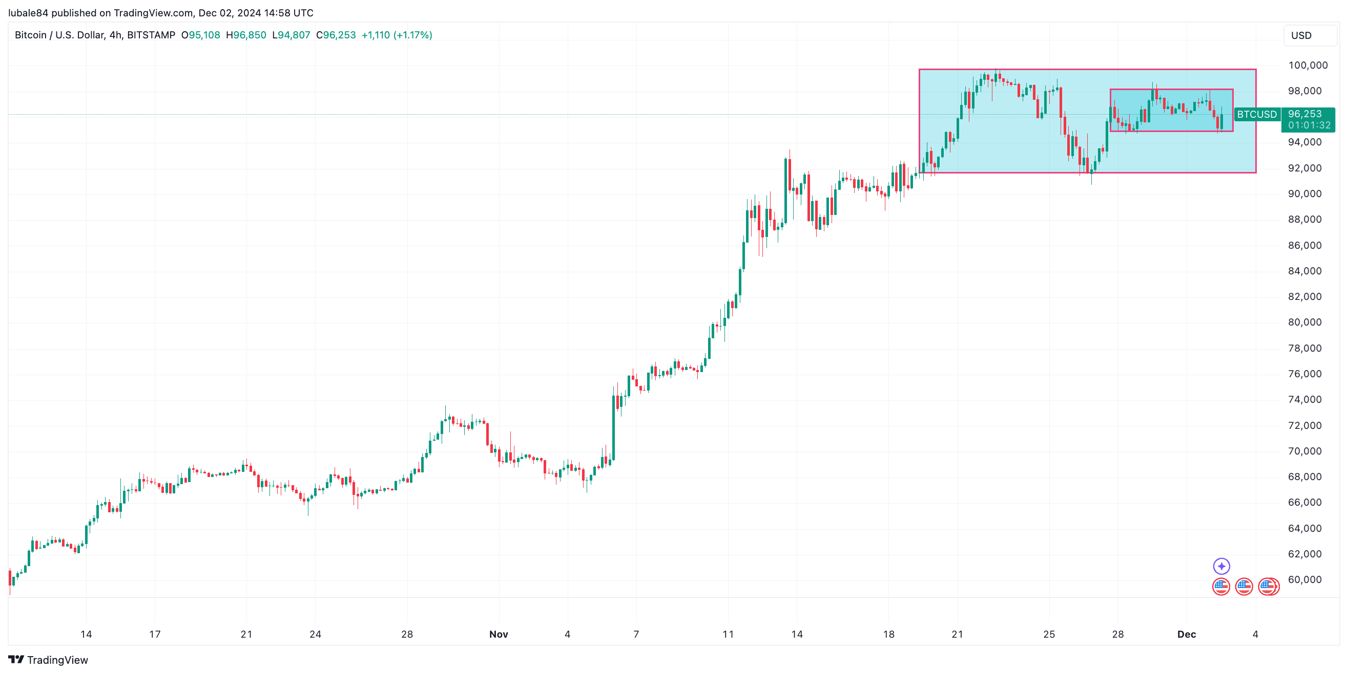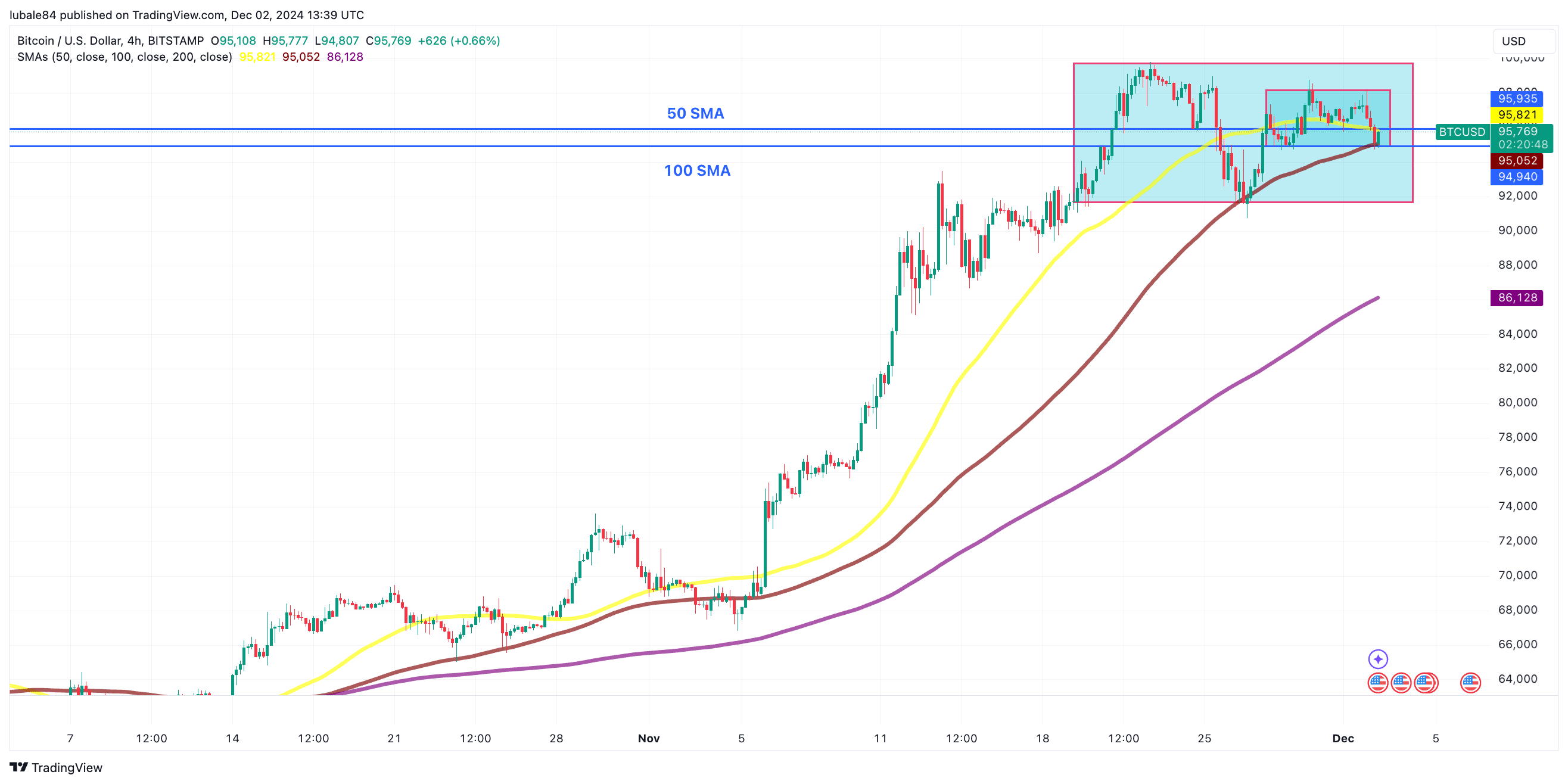 比特幣的價格一直在努力擺脫關鍵的阻力位和支撐位,50 週期簡單移動平均線 (SMA) 和 100 週期 SMA 在決定其走勢方面都發揮着重要作用。12 月 2 日,比特幣的價格跌破 50 週期 SMA,當時爲 95,821 美元。不過,它在 100 週期 SMA 處獲得了支撐,當時爲 95,051 美元。