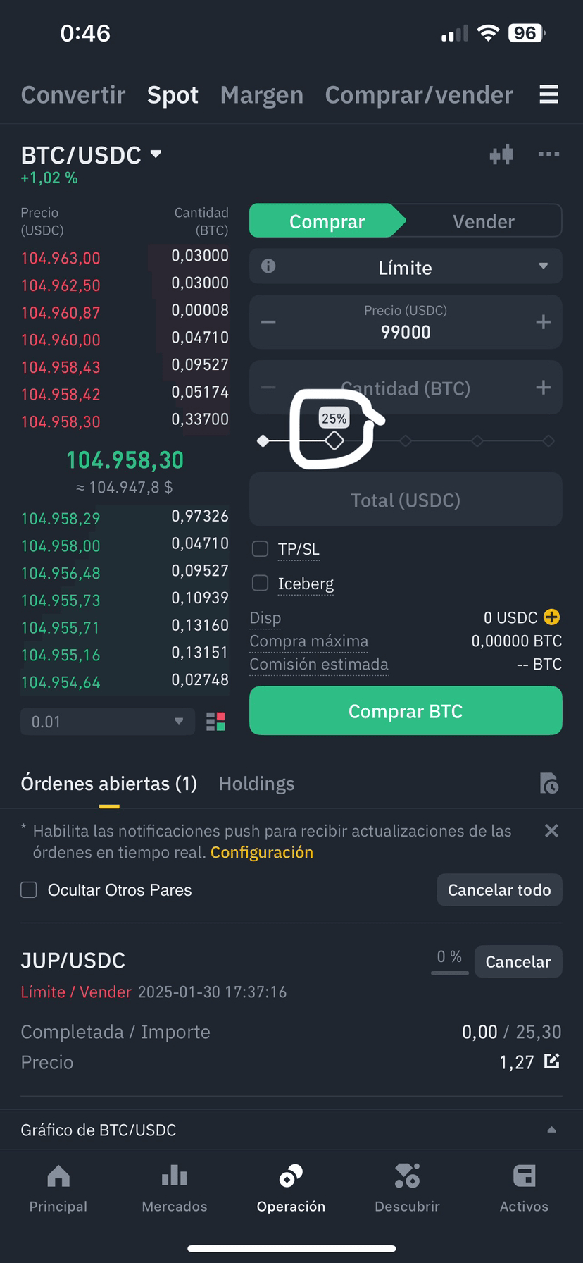 📌 現在你只需等待。如果價格降到99.000 USDC,訂單會自動執行。