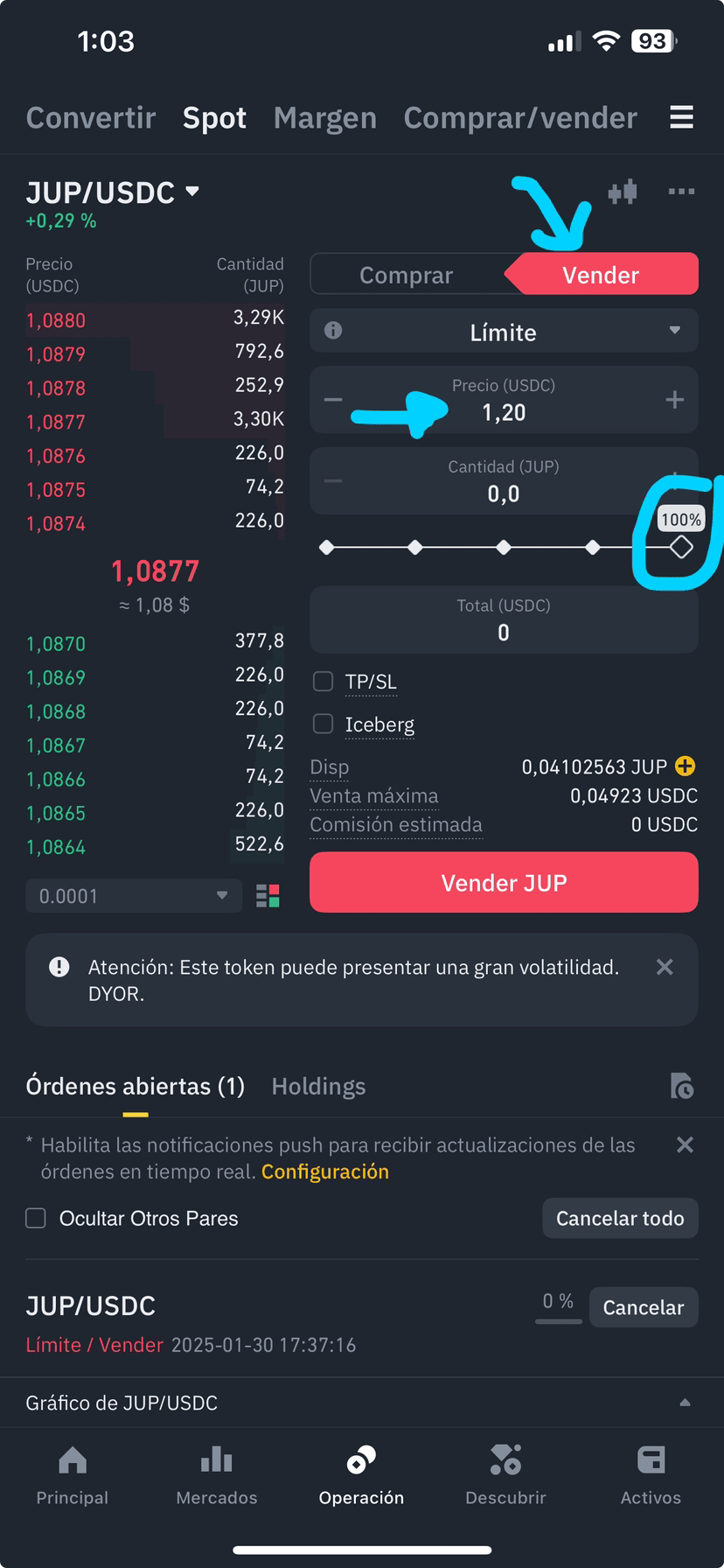 現在假設你已經有25 JUP,並希望在價格上漲到1.20 USDC時出售。