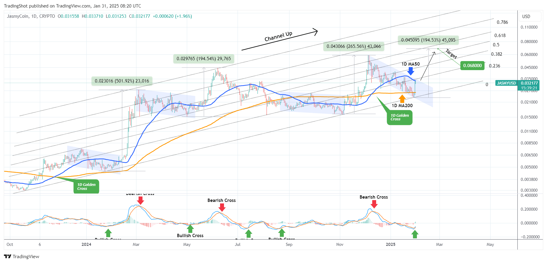 JasmyCoin(JASMYUSD)在一個15個月的上升通道內交易,本週價格直接觸及底部。這在技術上是該形態的高低點,並且自然地立即反應出反彈。