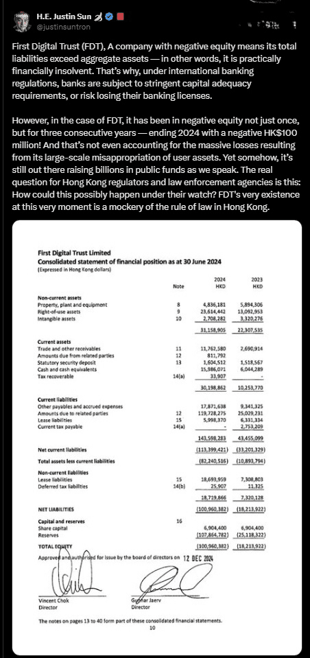 另一方面,FDT迅速作出回應。他們強烈否認孫的所有指控,並將其稱為毫無根據和誤導性的。該公司試圖通過強調其完全具備償債能力來安撫市場。他們還指出,他們的另一種穩定幣FDUSD是完全有儲備支持且透明管理的。FDT表達了決心,表示可能會採取法律行動來維護其聲譽。然而,孫並沒有退縮。他指向FDT自己的財務披露,顯示連續三年出現負資產,到2024年底報告出現超過1億港元的赤字。孫爭辯說,這些數字引發了對FDT財務治理和香港監管機構監管角色的嚴重質疑。他甚至在X平台上表示,“FDT在此刻的存在是對香港法治的嘲弄”,並附上了FDT資產負債表的截圖作為證據。這是一個典型的他說她說的案例,雙方都提出了自己的論據。🤷♂️🤷♀️