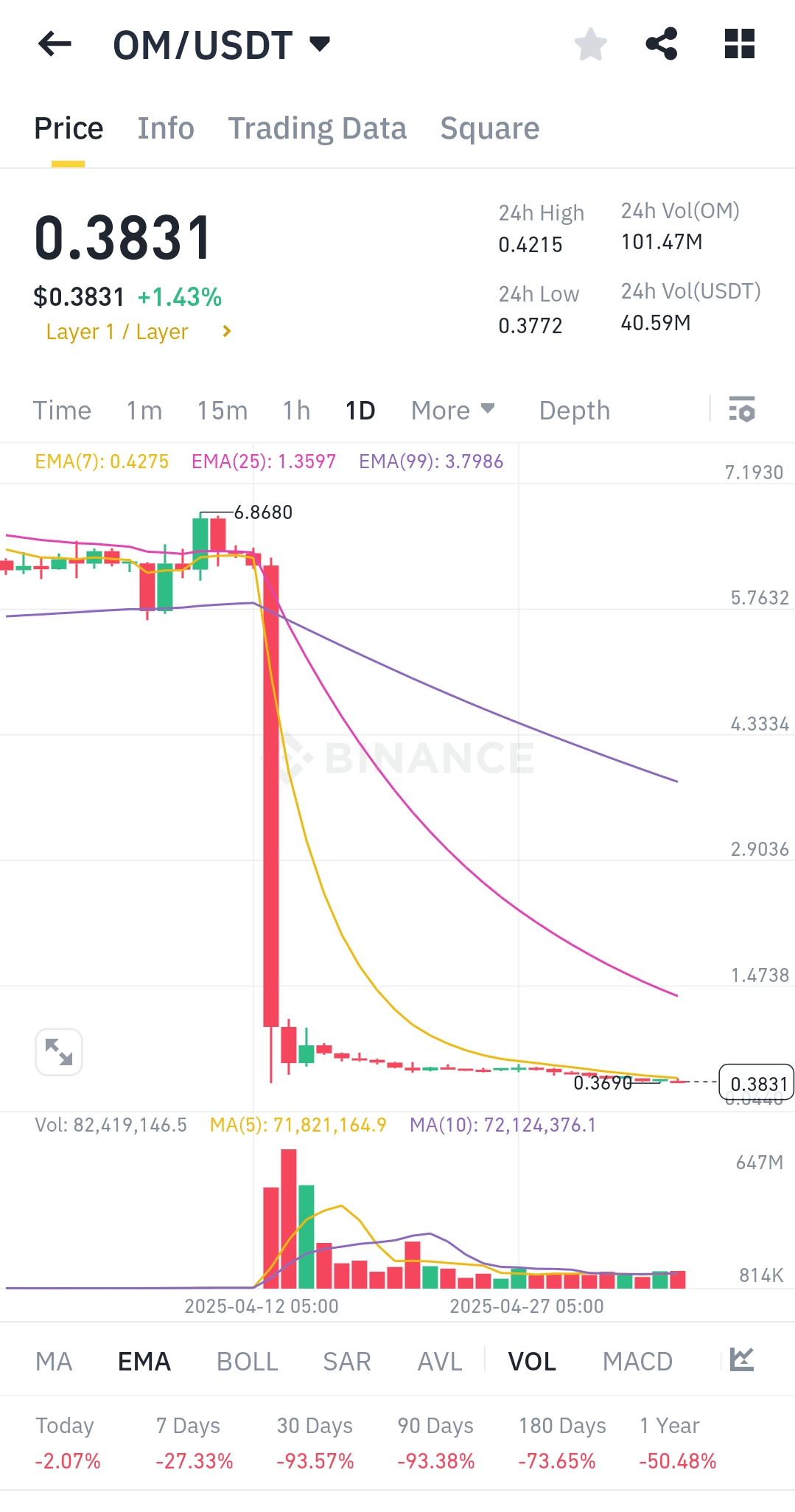 在2025年4月,Mantra(OM)從突破明星變爲破碎的夢想,從$6.30暴跌90%至$0.37。數十億的市場價值在幾天內消失,引發了加密社區的恐慌。