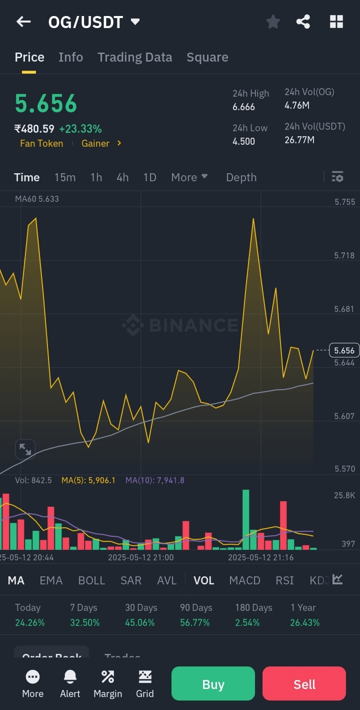 目前交易價格約爲 **\$5.61**,較過去 24 小時上漲 23.84%。該代幣的日內價格在 \$4.51 和 \$5.91 之間波動。