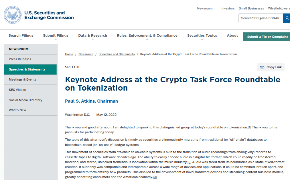 阿特金斯在SEC加密貨幣圓桌會議上發表了主題演講,確認了證券監管機構進入“新的一天”的開始。
