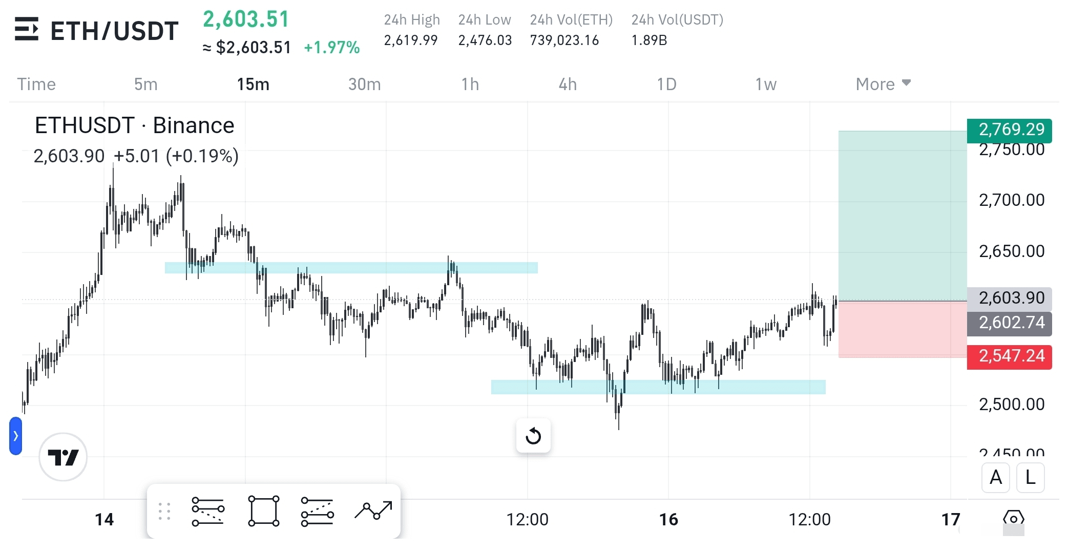 以太坊($ETH)在經歷了一段波動的整理後,悄然積聚動能,重新奪回$2,600水平。在15分鐘圖表上,ETH通過從$2,480–$2,500的強支撐區反彈顯示出韌性,形成潛在的看漲反轉模式。目前的價格行爲正在爲可能的突破設定$2,770的目標,多頭開始主導短期市場結構。