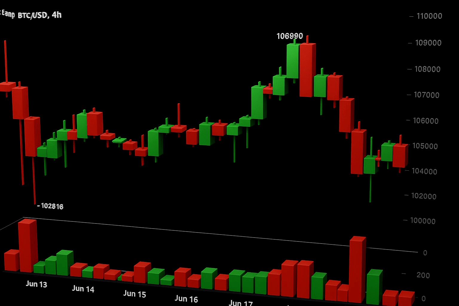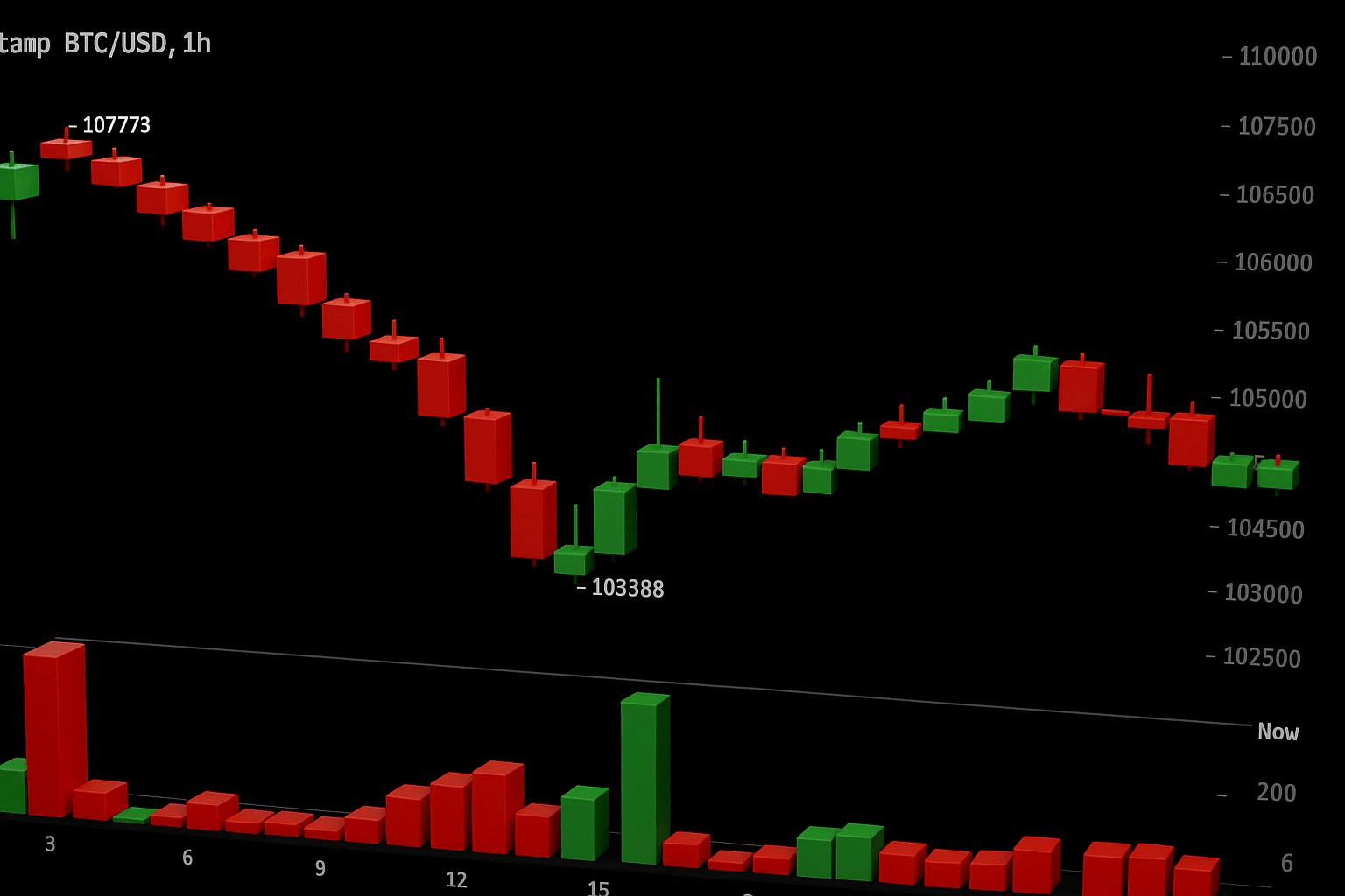 在 1小時圖上,比特幣從 1,07,773 下跌至 1,03,388 — 明顯下跌。