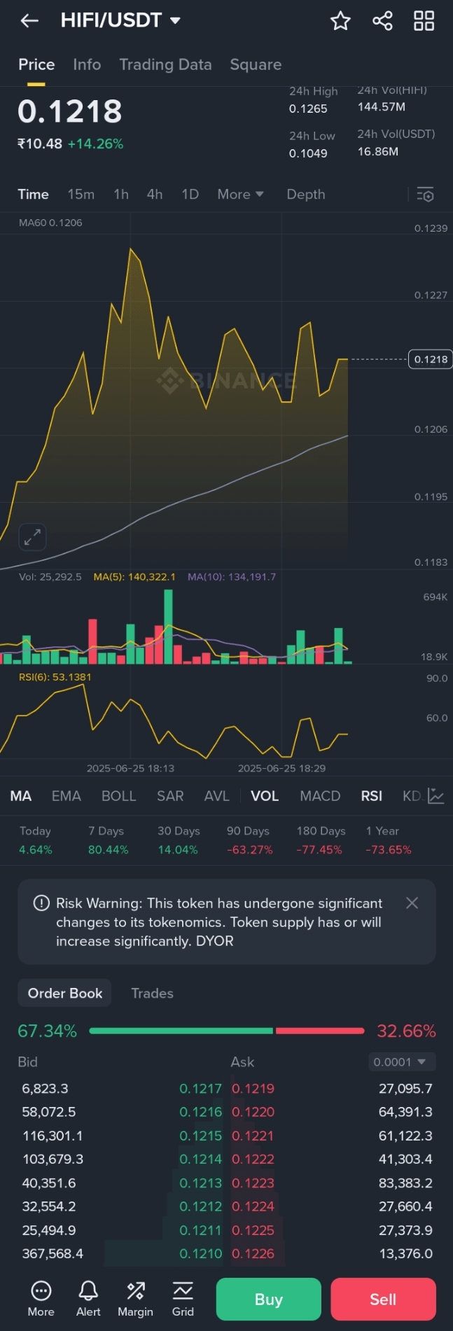 HIFI(Hifi Finance)交易價格約爲 \$0.123,24 小時上漲約 16%,日內波動從 \~\$0.106 到 \$0.125。