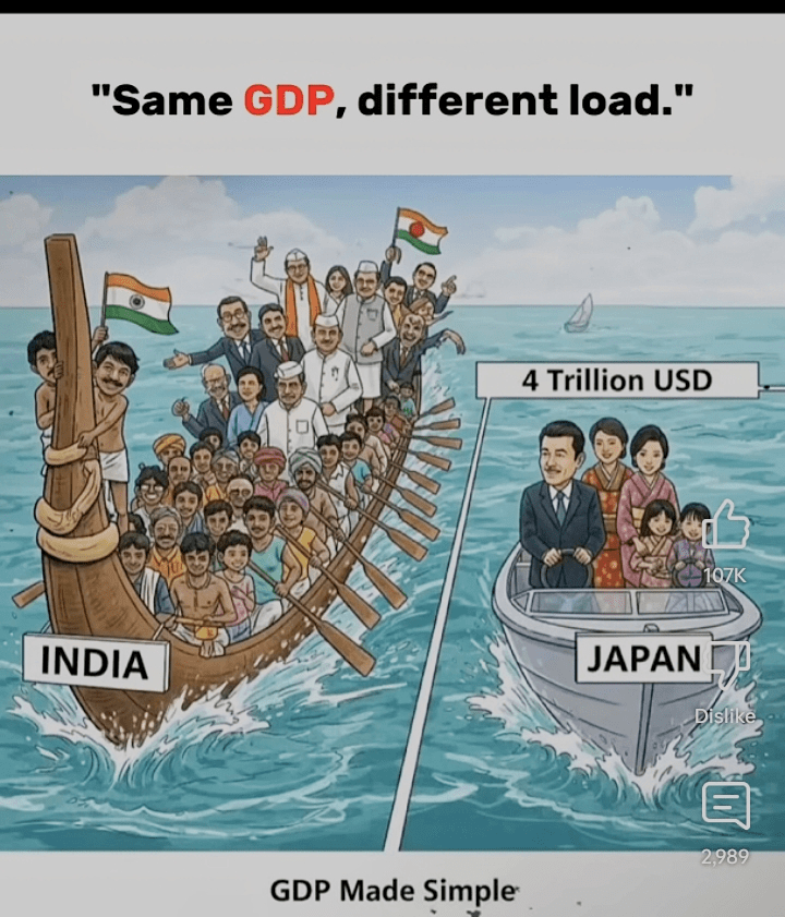 兩艘船上方都有一個標籤,標示爲“4萬億美元”,暗示這兩個國家的GDP是相同(或相似)的。漫畫的中心信息是“相同的GDP,不同的負擔”,這表明即使經濟產出相似,人口規模的不同也可能導致對個人公民和整體經濟效率的影響截然不同。儘管印度的GDP與日本相同,但由於其龐大的人口,印度似乎在前進中掙扎,而日本似乎在其較小的人口中輕鬆前行。