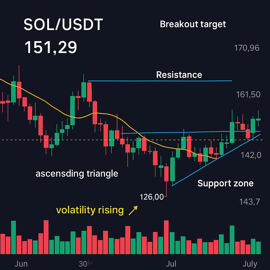 一個上升三角形模式正在形成,低點逐漸上升(126 → 142 → 149),壓縮在$161.5的阻力下。如果這個水平在成交量支持下被突破,可能會向$170.90甚至$180移動。