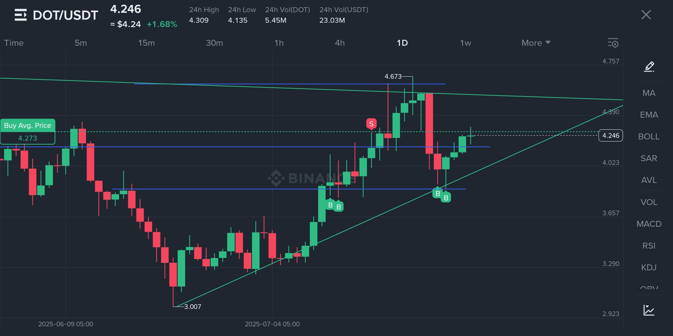 * **200 EMA:** DOT 正在嘗試重新奪回這一點 — 如果連續 3 天收盤高於此則看漲