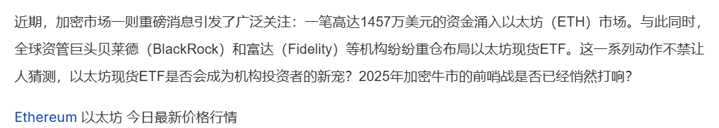 政策利好:美國SEC連批3只ETH現貨ETF,首周資金淨流入達8.3億美元;歐盟MiCA法規將ETH明確歸類爲“技術資產”,監管鬆綁推動機構資金加速入場。