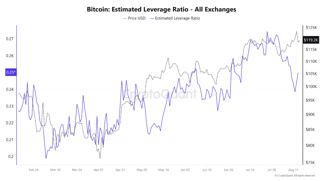 CryptoQuant 貢獻者 Arab Chain 的獨立分析研究了幣安的比特幣預估槓桿率(ELR),該比率衡量未平倉合約與交易所儲備的比值。最近,從 8 月初的高點 0.27 降至 0.25 左右,並在之後略有回升。