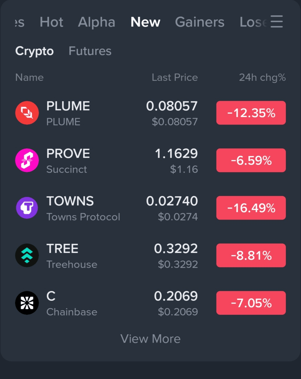 所有五個代幣都受到嚴重的賣壓。PLUME 由於代幣解鎖恐慌而引領下跌,而 PROVE、TOWNS、TREE 和 C 則跟隨更廣泛的熊市趨勢。
