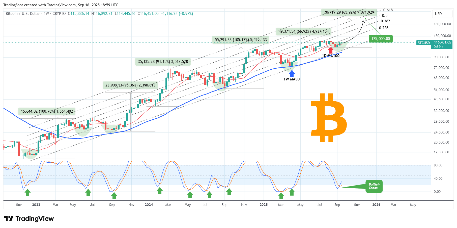 事實上,每一次 1W STOCH RSI 的看漲交叉都是在這個牛市週期的上升通道內的買入信號(自 2022 年 11 月以來),其中大多數都是巨大的。2025 年 4 月的看漲腿上漲了 +65.92%,而這也是這個上升通道中“最弱”的一次。