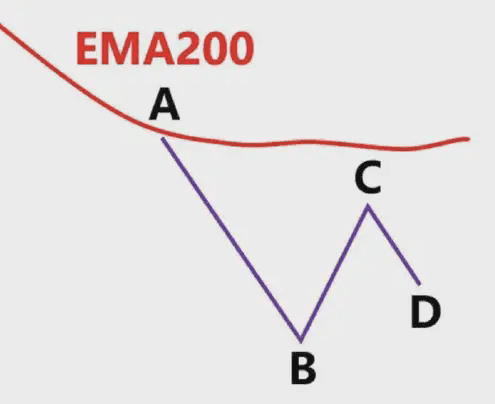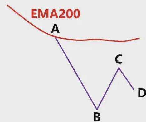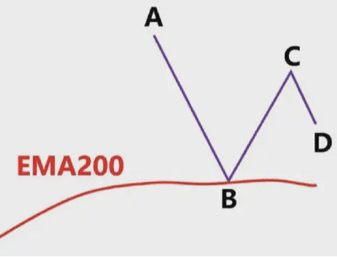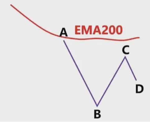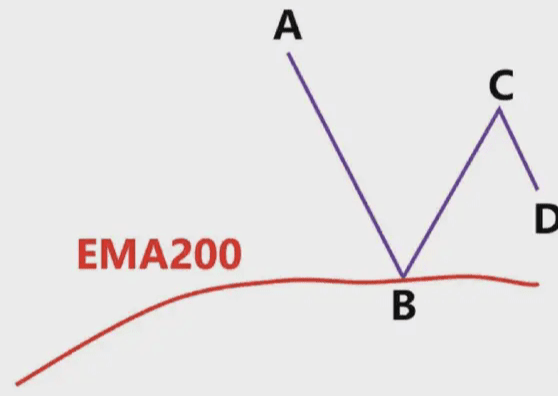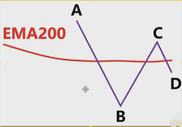 圖中藍色的線就是EMA200,我們看到低點A和高點B,此時價格在EMA200下面,我們只做空,不做多,我們以低點A畫一條綠色水平支撐線。