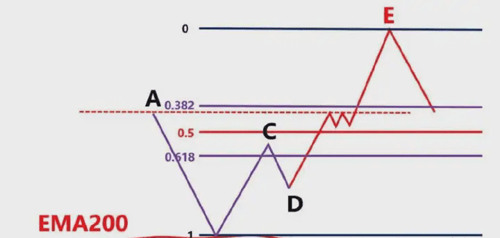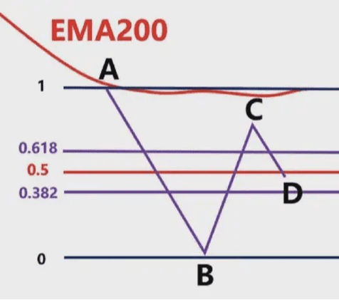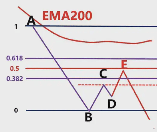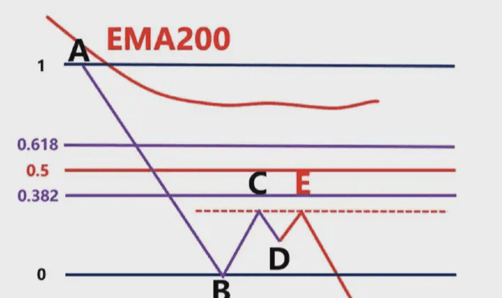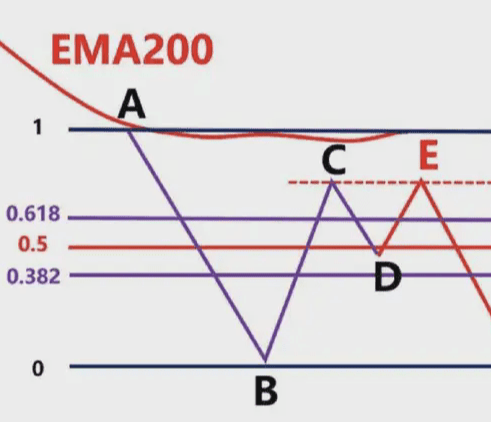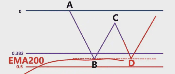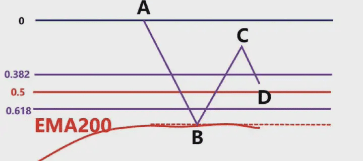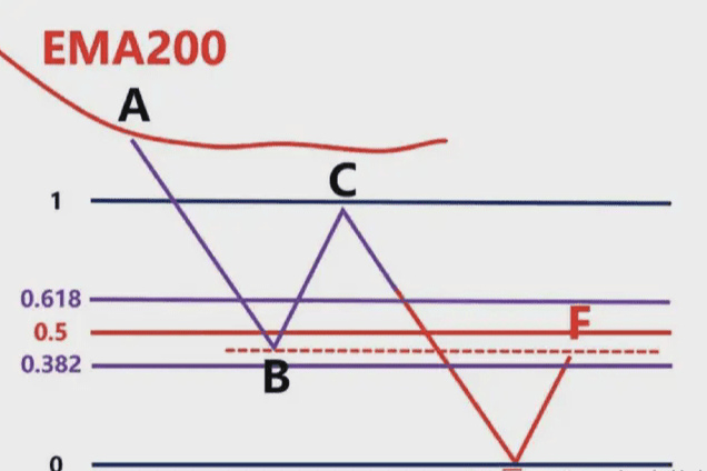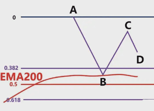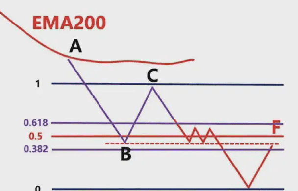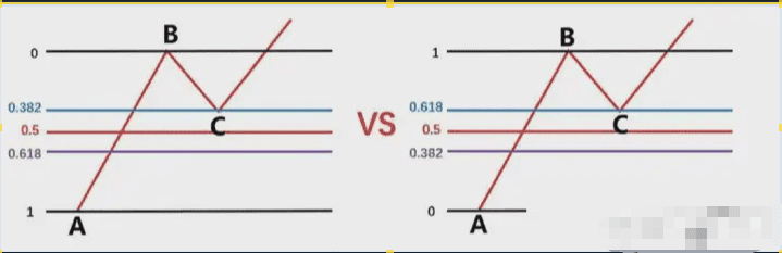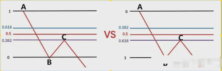 那麼我們就要根據,前波段高點A和前波段低點畫斐波那契,然後觀察B點的區域是否爲這個斐波那契回測的0.382-0.618的位置區域。