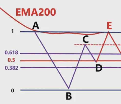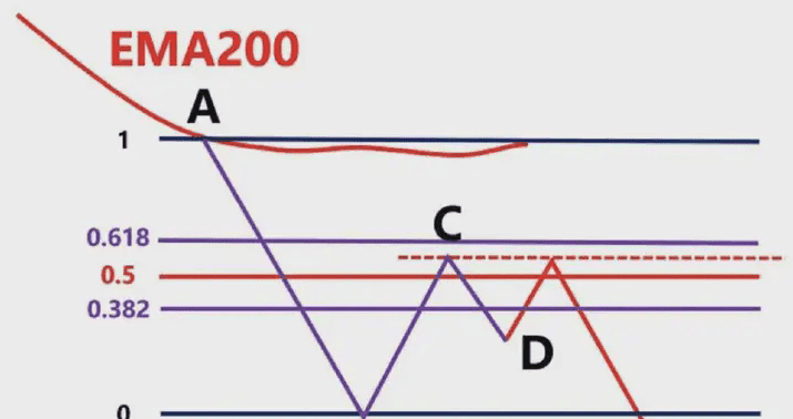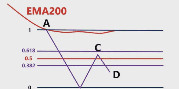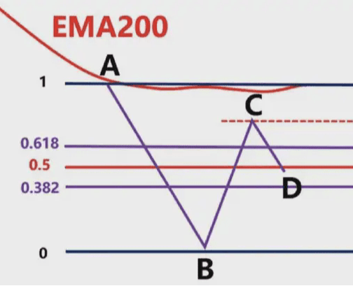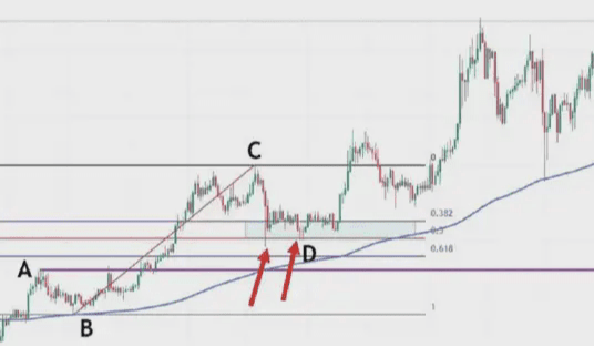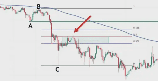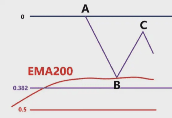 這時候我們就要根據,前波段高點A和前波段低點B畫斐波那契區域,然後觀察C點的位置是否爲這個斐波那契回測的0.382-0.618的位置區域。