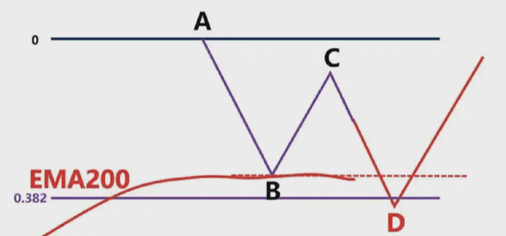 還有可能跌破支撐區域到D位置,形成AB和CD等距,且剛好D回調到斐波那契的0.382-0.618區域,然後繼續上漲,如圖2.4-26所示,