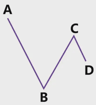 我們可以看到,價格從高點A下跌到低點B,然後上漲到高點C,C沒有突破前高A,這時候價格到了D的位置,我們應該怎麼畫呢?是以AB高低點畫,還是以BC高低點畫?