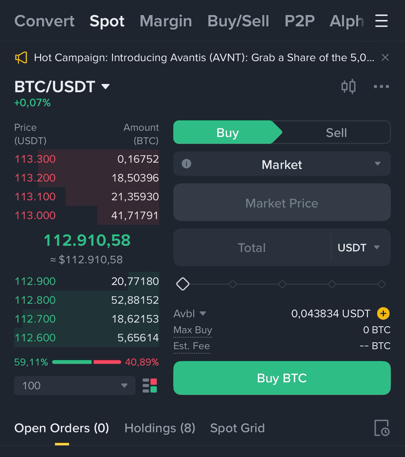 當有USDT時,可以進入菜單“交易” -> “現貨” 然後選擇交易對,例如: