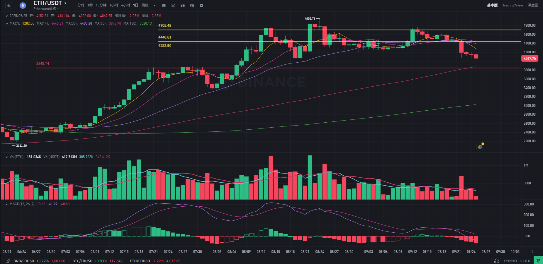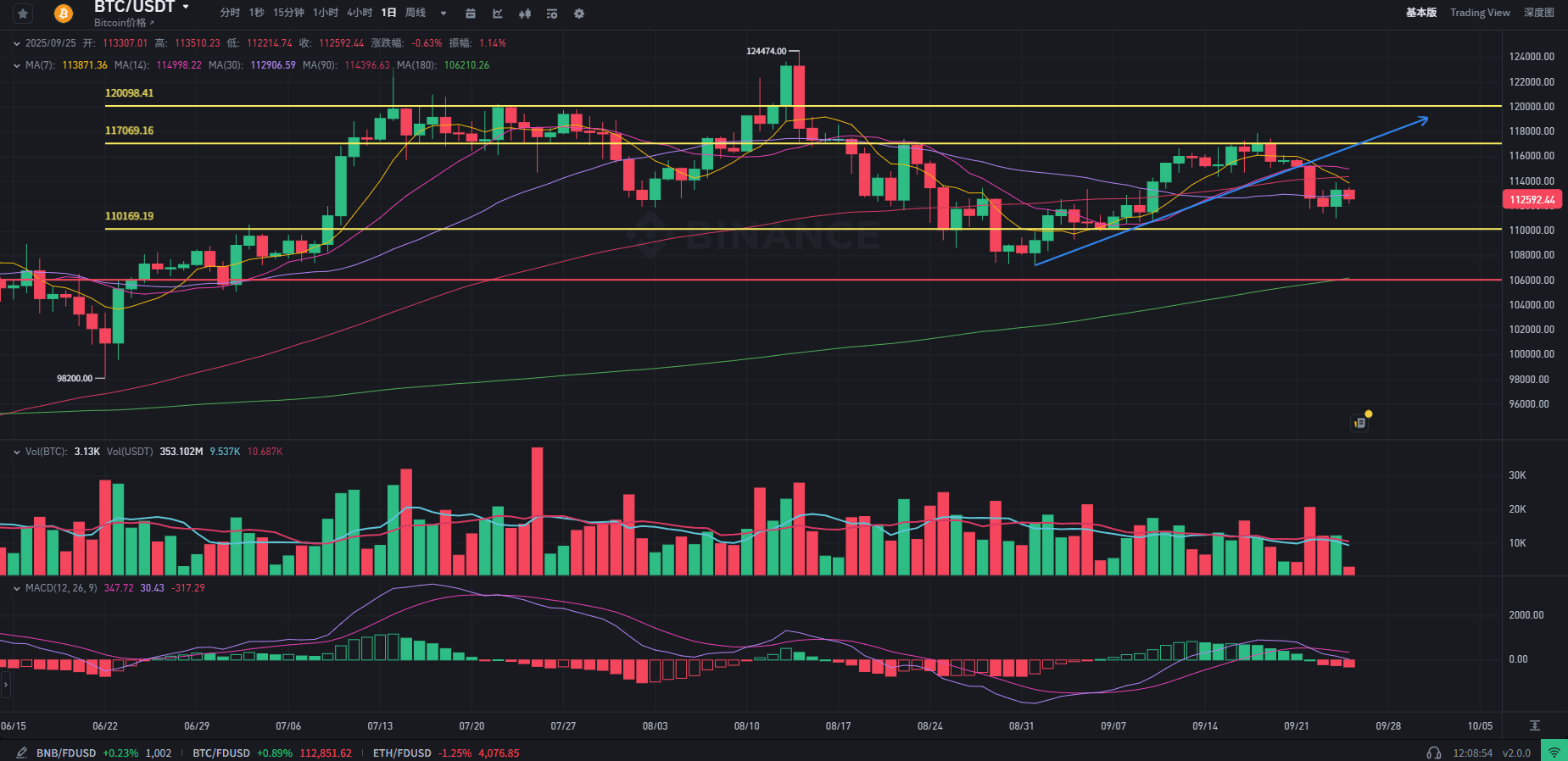 日線級別上,比特幣昨日經歷下探後收出一根小陽線,這一走勢屬於下跌趨勢中的震盪整理階段,同時也是對本週一大幅下跌後技術面出現的缺口進行修復,短期市場情緒仍偏向空頭;唯有價格重新站穩 11.7 萬關口(117K)上方,整體行情纔有望實現趨勢轉強。從市場環境來看,在美聯儲降息的大背景下,比特幣作爲 “數字黃金” 的屬性使其大概率成爲率先啓動的品種,而山寨幣因自身固有的高波動風險,在比特幣行情進入活躍期之前,較難獲得市場資金的重點關注。成交量維度呈現明顯特徵:下跌過程中量能持續放大,反彈階段量能卻顯著不足,這是典型的弱勢震盪走勢,表明當前市場仍由空頭主導。MACD 指標已形成死叉且持續向下發散,柱狀圖負值規模不斷擴大,空頭動能正逐步增強。近期需持續聚焦 11 萬整數關口的支撐有效性,若該位置被跌破,價格或將進一步下探至 10.6 萬附近(106K)。日內操作策略方面,上方需重點關注 11.32 萬 - 11.42 萬區間(113.2-114.2K)的壓力位,可在此區間把握看空機會;下方則重點留意 11.15 萬 - 11.05 萬區間(111.5-110.5K)的支撐強度。