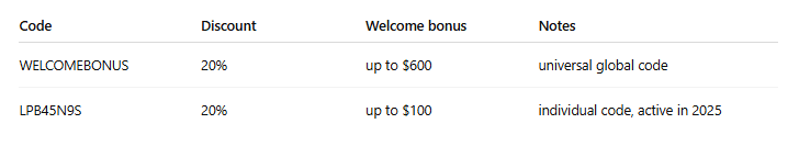 2025年最佳迎新獎勵代碼是WELCOMEBONUS和LPB45N9S。註冊時使用任一代碼均可享受現貨交易費20%的終身折扣,並獲得最高100美元的獎勵。