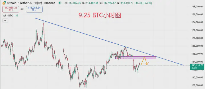 昨日一直關注113500壓力,突破站穩後會有一波快速衝高,但昨日最高只拉昇到113800就回踩,這表明市場不是強勢,不然市場就是連陽拉昇測試下一個阻力位,而盤面顯示目前只能以震盪方式應對,切記別追單