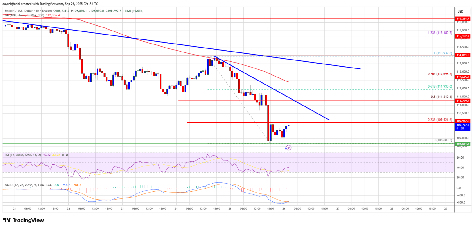 比特幣價格未能啓動反彈波動,繼續維持在114,000美元以下。比特幣跌破了112,500美元和112,000美元的支撐位,進一步進入了看跌區域。價格在111,500美元以下加速下行,形成了108,680美元的低點,目前價格正在整固下跌損失。價格略微回升至最近從113,939美元的高點到108,680美元低點的23.6%斐波那契回撤水平。