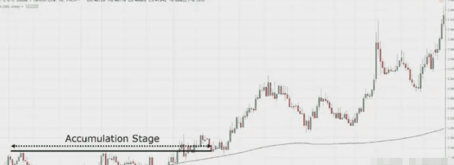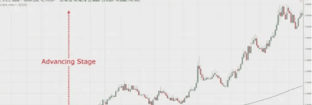 當價格突破吸籌區間上沿時,市場進入上升階段。表現爲高點與低點不斷上移的上漲趨勢,價格站穩200日均線上方,且200日均線開始拐頭向上。