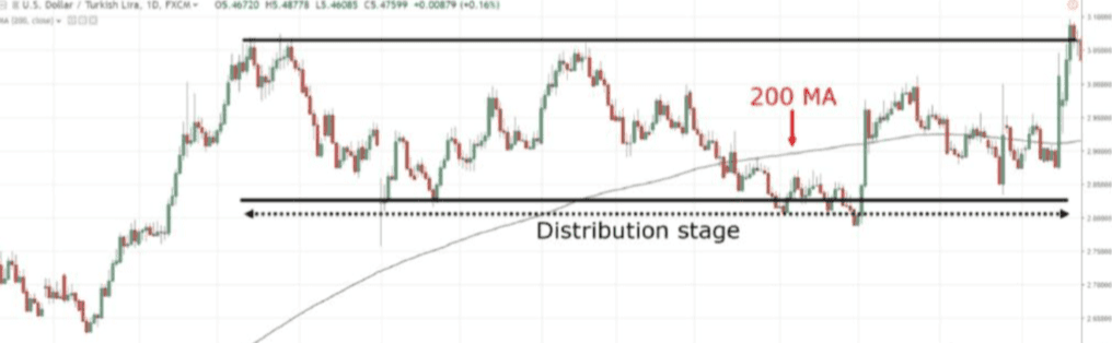 市場不會永遠上漲,當賣盤開始壓制價格時,首先會進入派發階段。表現爲上漲趨勢中的區間震盪,200日均線再次走平,價格圍繞均線震盪,顯示市場再次進入多空平衡狀態。
